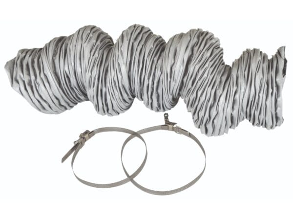 De GFKIT125-2M is een praktische accessoire voor het aansluiten van een ventilatiebox of filtermodule op een Exacta fytokast. De set bestaat uit een flexibele PVC-slang van 2 meter lang met een diameter van Ø125 mm, en twee metalen bevestigingsklemmen.